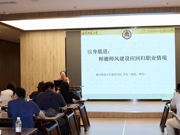 随后,曲阜师范大学李允教授作《以身载道,师德师风建设应回归职业情境》专题报告,从“重温师德师风的内涵及教育意蕴”“高校师德师风警示”“躬行实践,以德施教”几个方面,理论与案例相结合,阐述了新时代师德师风建设的意义、方向与实践路径。