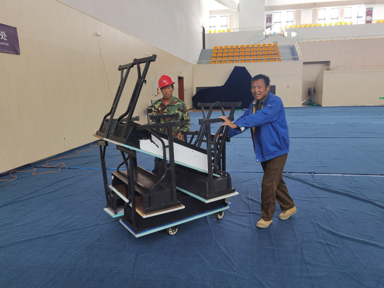 教学保障部为布置体育馆新生报到现场提前铺设地毯、搬运摆放桌子170张,椅子380个,为报到现场及志愿者服务点搬运瓶装水共460箱。