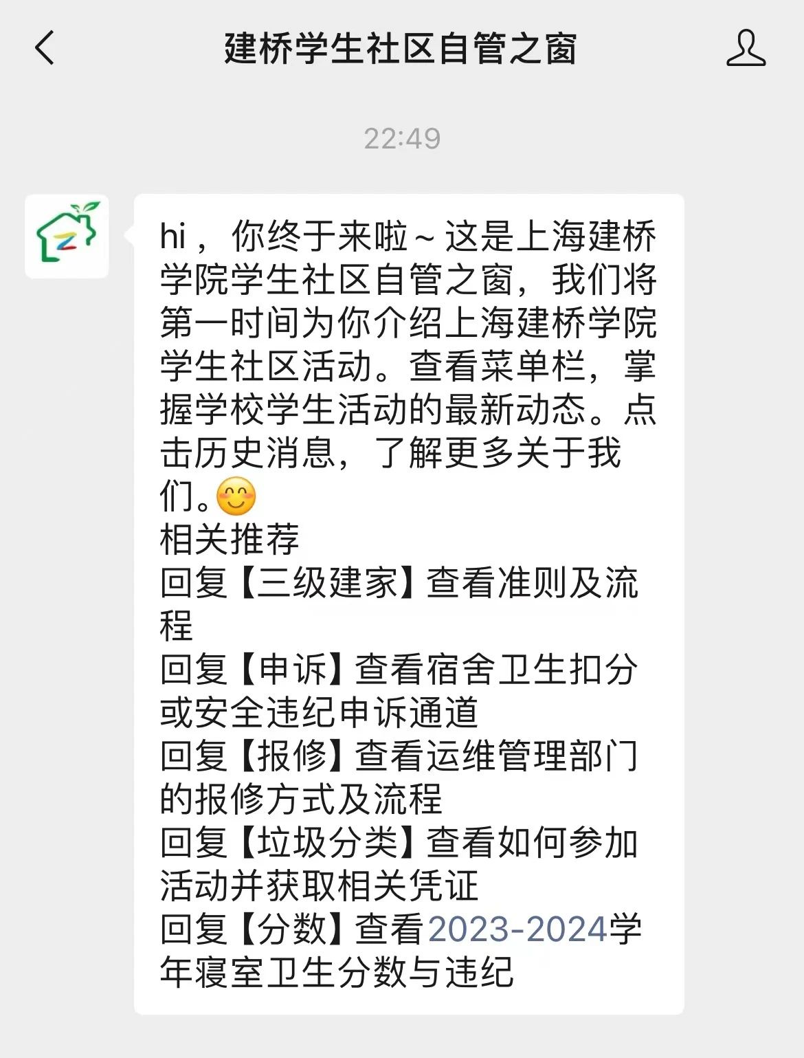 (2)若寝室触犯安全纪律行为,可在每次评分结果公布后填写《SJQU-QR-HB-539学生宿舍“三级建家”违反寝室安全纪律情况申诉表》(附结尾链接)后交予辅导员签字确认,在“建桥学生社区自管之窗”公众号内提交申诉材料,截至当周周五20:00。