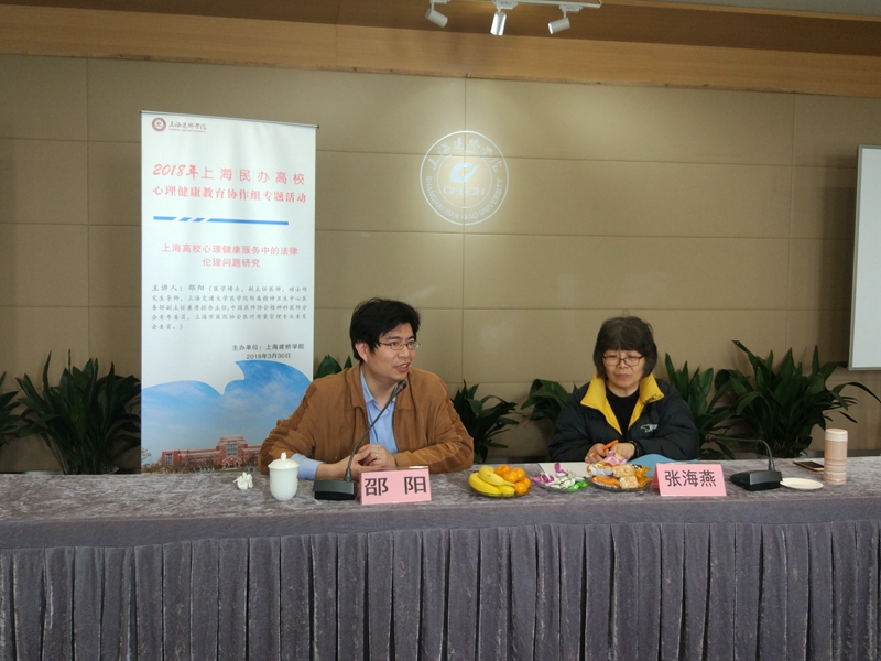 2018年3月30日12:45,上海民办高校心理健康教育协作组活动在上海建桥学院图书馆M617会议室召开。活动邀请上海交通大学医学院附属精神卫生中心医务部副主任兼质控办主任邵阳博士为民办高校心理健康教师和临港大学城心理健康教师组织培训,培训主题为《上海高校心理健康服务中的法律、伦理问题研究》,上海杉达学院、上海视觉艺术学院、上海中侨职业技术学院、上海立达职业技术学院、上海海洋大学、上海建桥学院心理健康教育老师心理辅导员和浦东教育发展研究院的老师参加了此次培训。活动由上海建桥学院心理健康教育与咨询中心顾问张海燕教授主持。