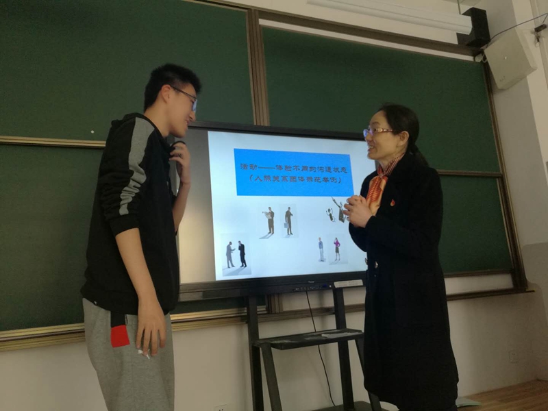 2018年4月25日14:35在三教114教室,学校心理健康教育与咨询中心专职心理咨询教师张翠芳指导2017级心理委员如何开展团体活动。