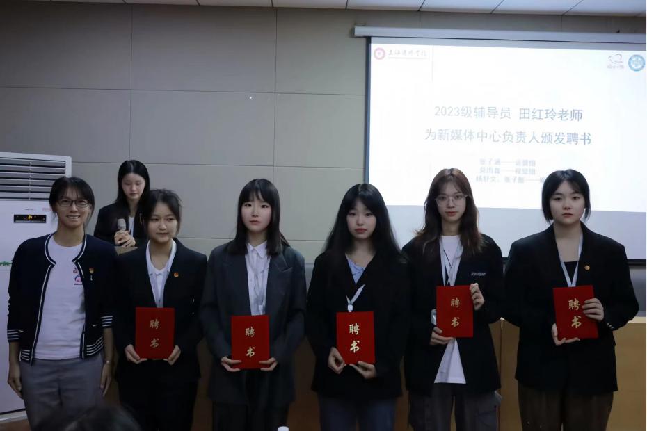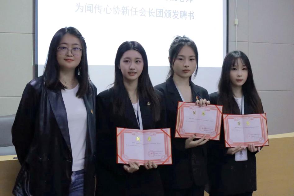 马丹妮老师、田红玲老师分别为会长团和各部门负责人颁发聘书。随后,由钱孝铭老师、曹汝朵老师为各位新干事授牌,也代表着各位新干事正式加入闻传心协的大家庭。