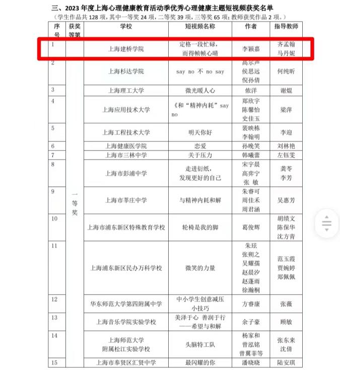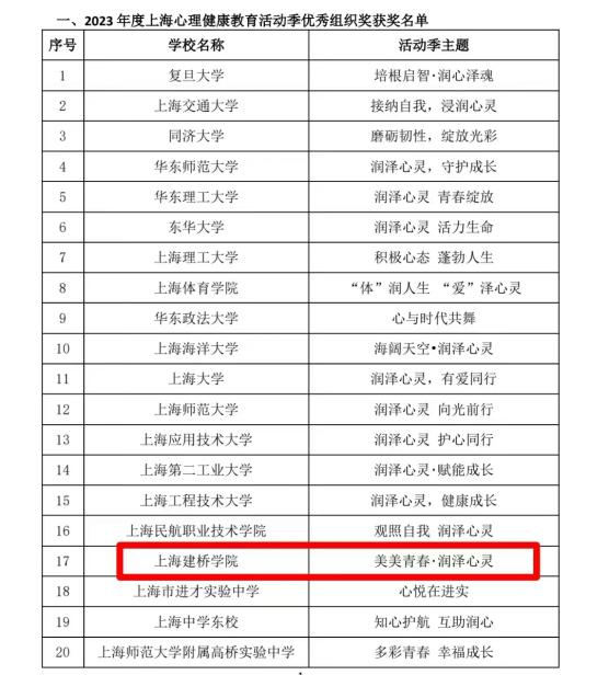 根据《关于2023年度上海学校心理健康教育活动季特色项目征集及优秀组织奖评审的通知》要求和各单位的评审和推荐,上海建桥学院“美美青春 润泽心灵”主题活动荣获2023年度上海心理健康教育活动季优秀组织奖。