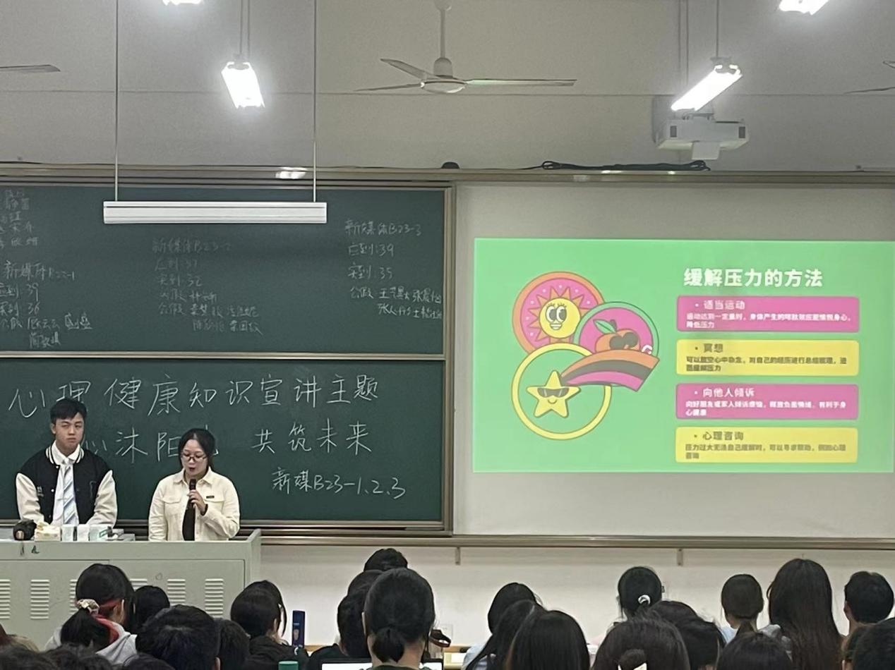 然后,史佳佳为同学们讲解了“摆脱不良情绪”的内容。她详细地为大家讲解了压力的定义与来源,并提出了缓解压力的四个有效方法:适当运动、冥想、向他人倾诉以及心理咨询。她指出,当遇到自己无法解决的问题时,及时向他人求助是最直接有效的办法。