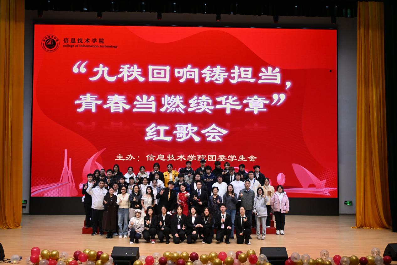 青春与时代同频,歌声与家国共振。11月23日18时30分,雷锋礼堂内灯光璀璨、掌声雷动,信息技术学院“九秩回响铸担当,青春当燃续华章”2025级新生红歌会在此圆满举行。全体新生以歌为媒,回溯红色岁月,礼赞伟大祖国,在激昂旋律中诠释青年担当,为校园注入澎湃的青春力量。 本次红歌会特邀信息技术学院分团委书记赛孟其、指导老师李苧薇及2025级新生辅导员张雨晨、张峰、谭敬敬、王圣洁担任评委。计科B25-5《我们都是追梦人》随着轻快旋律奏响,计科B25-5班以一曲《我们都是追梦人》拉开红歌会序幕。同学们精神饱满、意气风发,用嘹亮歌声勾勒出当代青年逐梦前行的鲜活图景,“奔跑”与“追赶”的歌词意象,恰是新时代学子以奋斗践行理想的生动写照,蓬勃朝气感染着现场每一位观众。 网工B25-1/网工B25-4《少年中国说》网工B25-1班与网工B25-4班带来的《少年中国说》瞬间点燃全场气氛。“少年自有少年狂,身似山河挺脊梁”,激昂的旋律搭配铿锵有力的演唱,将梁启超先生笔下的少年意气展现得淋漓尽致,歌声中满是青年接棒时代的底气与锋芒。数媒B25-3《有我》数媒B25-3班的《有我》节奏舒缓却力量充盈,每一个
