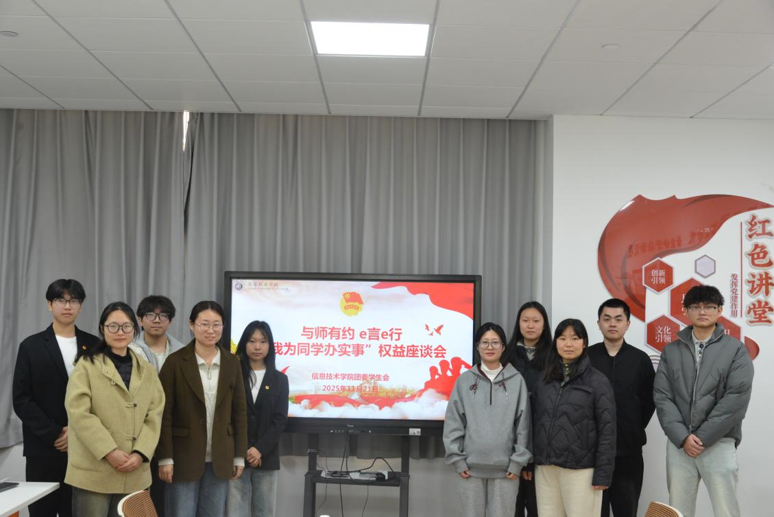 在党的二十大报告中指出:全党要把青年工作作为战略性工作来抓,用党的科学理论武装青年,用党的初心使命感召青年,做青年朋友的知心人、青年工作的热心人、青年群众的引路人。为深入落实“我为同学办实事”工作要求,切实倾听学生心声、解决实际诉求、维护学生权益、推进校园建设,11月21日,信息技术学院在北七北八共享区召开“与师有约 e言e行”权益座谈会。本次座谈会由权益部部长陈优倩主持,院团委书记赛孟其老师、院团学指导老师李苧薇老师、社区横向负责老师濮春婷老师、院关工委秘书黄迪老师,以及信息技术学院的学生代表们参与。2025年度提案工作汇报信息技术学院分团委学生副书记陆君豪汇报了2025年度提案工作情况。经前期广泛调研、精准收集,权益部共梳理形成16份关于教育教学、成长成才、生活服务以及权益维护等领域的有效提案,为本次沟通会搭建起精准高效的沟通桥梁。学生代表提案汇报学生代表李沁芸、王智研、赵梓睿将事先收集并整理好的提案进行提出,务实恳切、针对性强,包括校园路面通行、禁烟管理等生活起居相关诉求,以及学习资源更新、在线教学平台功能完善等学习资源类问题。学生代表的发声传递真实诉求,多方回应凝聚整改共