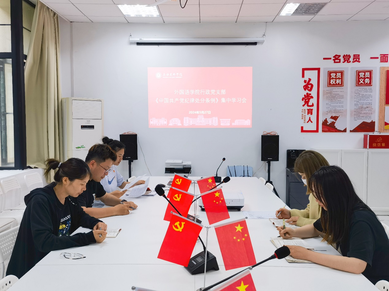 为深入推进党纪学习教育走深走实,5月27日下午,外国语学院行政党支部在303会议室召开《中国共产党纪律处分条例》(以下简称条例)集中学习会。外国语学院行政党支部全体党员参加会议,会议由支部书记陆璐主持。会上,支部书记陆璐首先传达了学校党纪学习教育的工作提示,以及上海建桥学院外国语学院党纪学习教育的具体工作安排,强调支部党员要原原本本、逐章逐条学习《条例》,把《条例》学深悟透、学懂弄通,做到学纪、知纪、明纪、守纪,用党规党纪规范思想和行动。随后,支部党员分工领学了《条例》各章节,认真研读原文,将“六项纪律”的具体规定搞清楚弄明白。最后,支部党员一同观看党纪学习警示教育案例,原应急管理部消防救援局党委委员、副局长张福生案,通过以案为例,更好地发挥警示教育作用,教育引导支部党员时刻敬畏纪律和规矩。行政党支部将以党纪学习教育为契机,切实扛起主体责任,确保党纪学习教育走深走实、入脑入心,将遵规守纪内化化于心、外化于行,营造风清气正的学院氛围,为推动学院高质量发展提供强大动力。