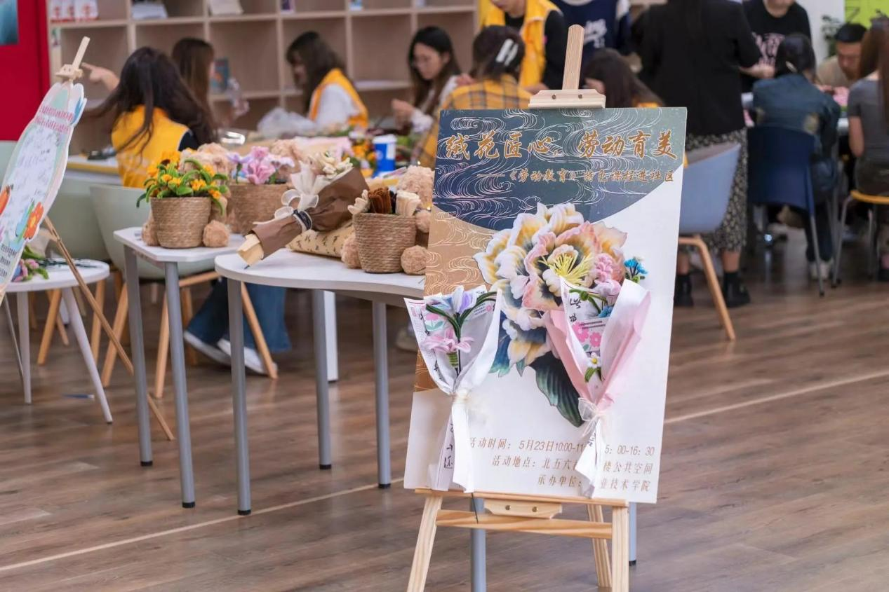 2024年5月23日,正值第四届“上海市学生劳动教育宣传周”之际,上海建桥学院职业技术学院开展《劳动教育》特色课程进社区系列活动,在当今快速发展的社会中,教育不仅是传授知识,更是培养人格、塑造未来的重要途径。“绒花匠心·劳动育美”——手工制作活动是以绒花题材表达吉祥如意之意趣,以此为载体宣传传统手工艺制作与匠人精神,不仅培养了学生的动手能力,还让学生在实践中愉悦身心,缓解压力,实现以劳育美、以劳健心。活动现场,同学和老师们首先学习了绒花的制作技艺。从选材、裁剪到编织,每一步都需要精心细致的操作。在志愿者的指导下,大家纷纷动手实践,虽然过程中遇到了不少困难,但每个人都坚持不懈,最终都完成了自己的作品。通过劳动,能够体验到成功的喜悦和失败的挫折,学会面对困难和挑战,增强心理韧性,同时也在劳动中培养了耐心、细致和坚持不懈的品质。此次活动过程中,朱瑞庭校长也来到了现场,对于此次活动,他予以大家“让爱发芽”的嘱托。此外,还与滨河社区居民一同切身体验劳动带来的乐趣,在制作绒花的过程中,他们需要细心观察、耐心操作,这不仅锻炼了他们的专注力和动手能力,还让他们学会了如何在忙碌的生活中找到平静与安宁。绒