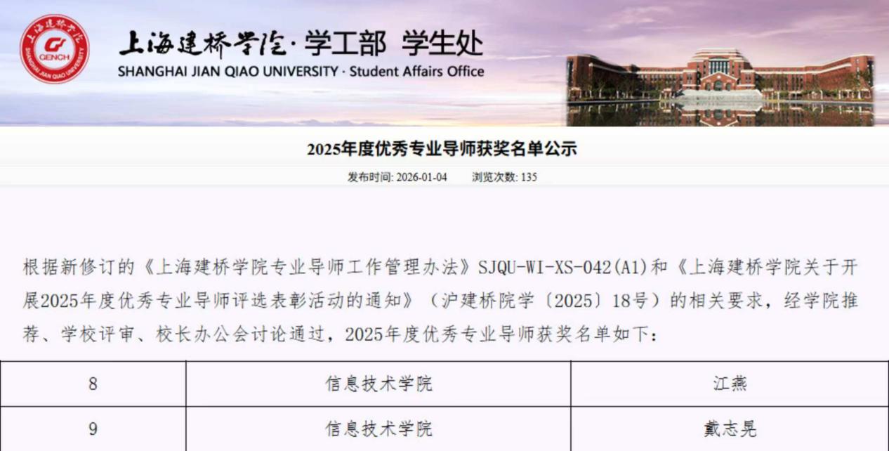 信息技术学院戴志晃、江燕获评上海建桥学院2025年度“优秀专业导师”