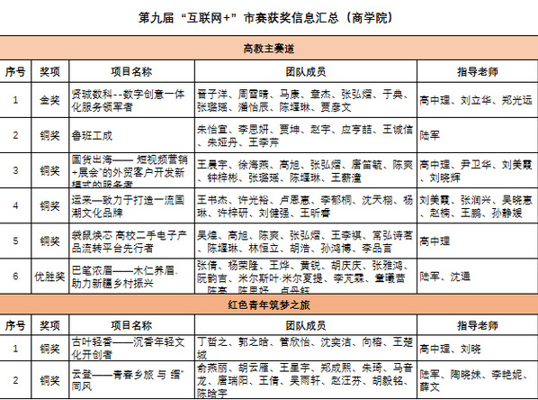 近日,上海市教育委员会公布了第九届中国国际“互联网+”大学生创新创业大赛(上海赛区)获奖名单。在本次大赛中,商学院学子勇获1金6铜,首次摘得金牌,同时获奖数量再创新高。 近年来,商学院高度重视大学生创新创业教育工作,在商学院党政领导的支持下,成立了商学院创新创业指导中心,加强顶层设计与机制建设,持续深化创新创业教育改革。为培养“敢闯会闯”的新时代创新型高素质人才,在创新创业学院的指导和帮助下,我院以“互联网+”大学生创新创业大赛、“挑战杯”大学生课外学术科技作品竞赛等龙头赛事为抓手,深入推进赛教融合,积极构建“院级、校级、市级、国家级”四级创新创业竞争体系,以赛促学、以赛促教、以赛促创,持续加大对学生参加各类创新创业竞赛活动的支持力度,营造了良好的创新创业教育文化氛围。