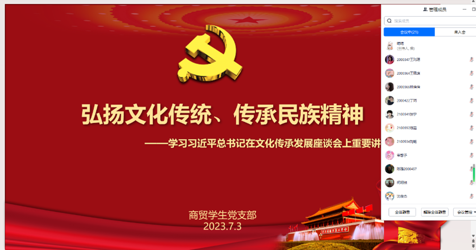 2023年6月29日,职业技术学院综合学生党支部召开“做中国文化的传承者与弘扬者——学习习近平总书记在文化传承发展座谈会上的重要讲话精神”主题党日活动,支部书记张曼主持本次活动,支部全体党员参加。会上,各位党员结合自身的学习生活和工作发表了自己的感想:张骆来同志讲到传承中华优秀传统文化,要依据新的时代发展需求,赋予中华优秀传统文化新的时代内涵。黄宇涵同志说到把马克思主义基本原理同中国具体实际、同中华优秀传统文化相结合是必由之路。杨伽玮同志结合自身的工作谈到对文化传统的感受,提出一个国家,一个民族中,千千万万的个体之间需要一个互相连接纽带,而对传统文化的学习和认同就是一个优良的载体。顾苏敏同志说到中国地大物博,各区域都有自己的文化特色和文化底蕴,需要我们去认真了解、摸清家底。只有知晓中华文化是如此丰富多彩、博大精深,我们的文化自信才会更有底气。最后,支部书记张曼就年轻一代的责任与使命发表了自己的观点,表示通过主题党日活动感受到了在新时代下作为年轻一代在推动文化繁荣、建设文化强国、建设中华民族现代文明上的光荣使命,在学习生活和工作之外,要为祖国的文化传承、发展、创新、贡献一份绵薄之力。青壮