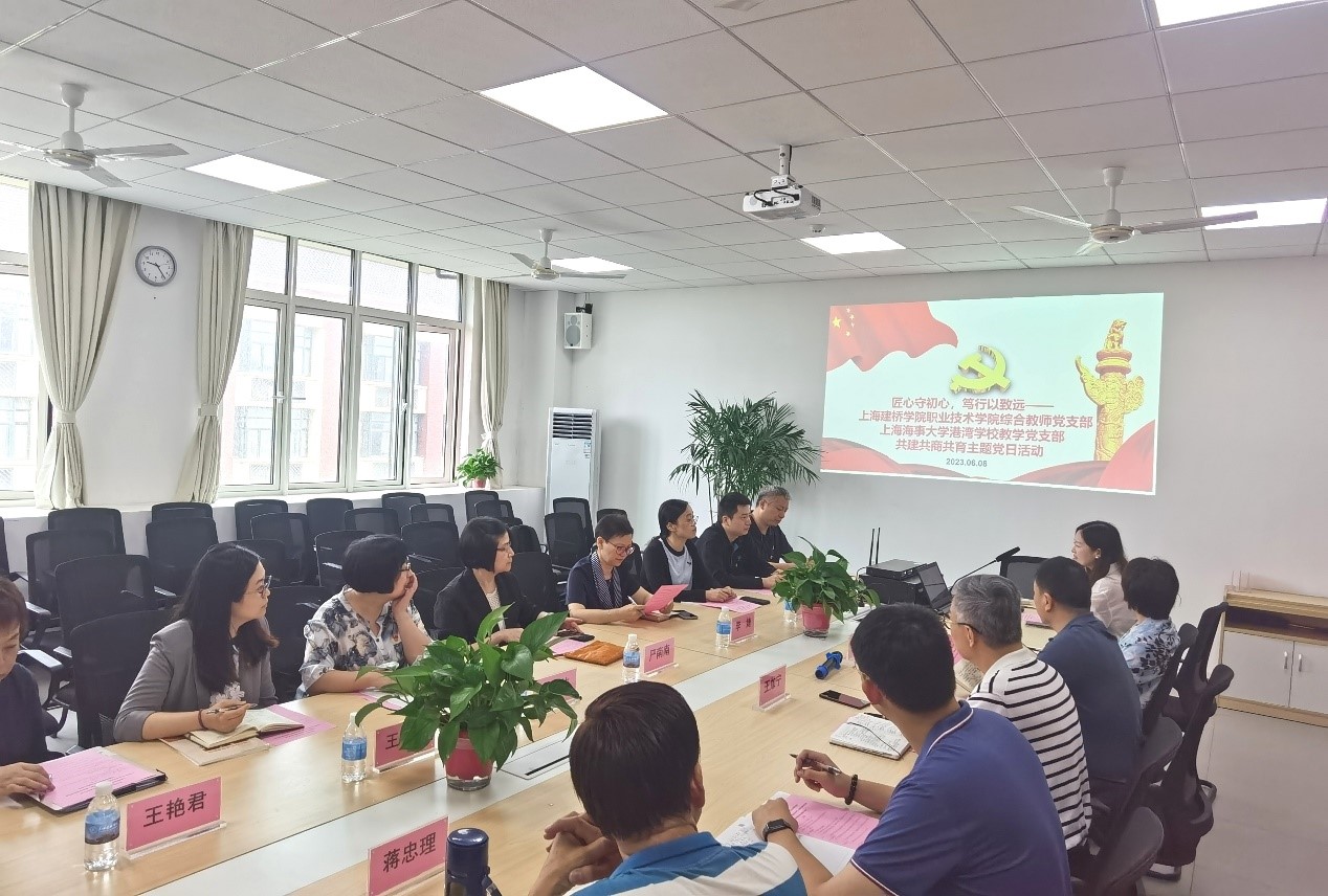 6月8日下午,上海海事大学港湾校区党委书记李婕、副(院)校长严南南、教学党支部书记葛江伟等一行8人赴上海建桥学院职业技术学院参加“共商、共建、共育”主题党日活动。上海建桥学院职业技术学院院长谷伟、党委书记王加宁、副院长陈莲君、综合教师党支部书记臧玉洁等相关部门负责人负责接待并出席了本次活动。活动由职业技术学院综合教师党支部支部书记臧玉洁主持。本次活动的第一部分是主题教育理论学习和研讨。双方回顾了自2022年11月支部共建以来的工作开展历程,深入学习了习近平总书记关于“新时代教育高质量发展”的重要论断。王加宁书记指出希望通过支部间的共建、共商、共育,进一步明确不同学段的育人目标,做好育人衔接,切实把学生培养好,以实际行动践行“以人民为中心”的教育理念。综合教师党支部蒋忠理老师对中高贯通班毕业生的就业情况、人才培养计划、学生管理等方面的培养成果及不足之处进行了总结;提出要因材施教,遵循教育规律、教学规律、人才成长规律,探索产教融合模式,真正做到为党育人、为国育才。李婕书记表示支部共建是校区党委今年的工作重点之一,希望通过支部共建,切实做到党建与业务同谋划、同部署、同推进,共同做好中高贯通人