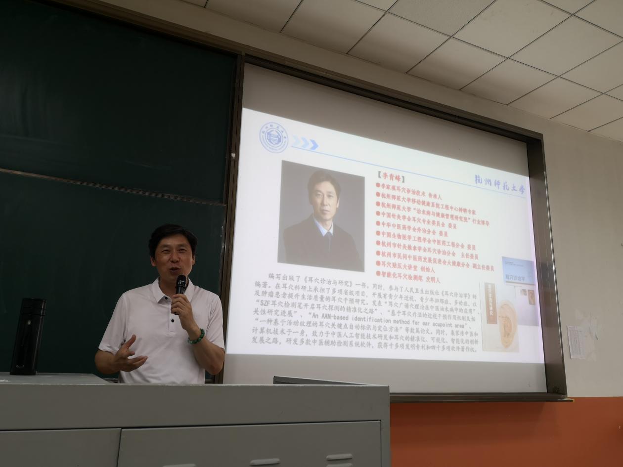 2023年6月1日14:00,健康管理学院在三教120教室举行了“百家讲坛”主题讲座。学院特邀李家琪耳穴诊治技术传承人、杭州师范大学移动健康系统工程中心特聘专家、杭州师范大学“治未病与健康管理研究院”行业博导、中国针灸学会耳穴专业委员会委员李青峰教授为学院师生作了题为“耳穴疗法的传承与发展”的主题讲座。讲座由健康管理学院与科研处共同举办,健康管理学院院长王志雄教授主持。李青峰教授作为李家琪耳穴诊治技术传承人、中国针灸学会耳穴专业委员会委员、中华中医学会外治分会委员、耳穴贴压大讲堂创始人、智能化耳穴检测笔发明人,集家传中医和计算机技术于一身,致力于中医人工智能技术研发和耳穴的精准化、可视化、智能化的创新发展,编写出版《耳穴诊治与研究》等多部著作,承担多项省级研究项目。同时,研发多款中医辅助检测系统软件,获得十多项发明专利和四十多项软件著作权。讲座中李青峰教授从耳穴疗法的起源、近代体系的形成讲起,通过科研与临床应用的多项案例,带领大家全面了解了中医特色的耳穴技术及近代耳穴疗法的国际化发展趋势,并重点讲解了近代耳穴疗法生物神经学机制的相关研究,及其未来在脑科学发展中的应用问题。强调中医的发展