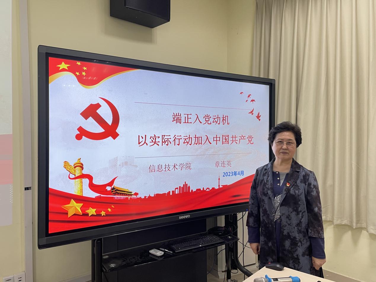 2023年4月25日,外国语学院第24期入党积极分子培训班专题党课第五讲于外院129顺利进行,校关工委成员、信息学院党委组织委员章连英老师以《端正入党动机,以实际行动加入中国共产党》为主题为学员们开讲。章老师从“青年兴则国家兴,青年强则国家强”、“请党放心,强国有我”、“端正入党动机,以实际行动加入中国共产党”三方面为学员们进行了讲解。首先,章老师向学员们讲述了革命先辈们的光荣事迹,他们为了革命事业抛头颅、洒热血,为建立和建设新中国倾注了毕生心血,为人民美好生活而不懈奋斗,值得吾辈青年学习。作为新一代青年,学员们应当明白未来属于青年,希望寄予青年,生逢其时,肩负重任。章老师希望学员们以初生牛犊不怕虎,越是艰险越向前的刚健勇毅,永立时代潮头、争做时代先锋。入党积极分子要以实现中华民族伟大复兴为己任,志存高远,脚踏实地,把个人的理想追求融入党和国家事业之中,为党、为祖国、为人民多作贡献。接着,章老师为学员们介绍了许多我校具有先锋模范作用的优秀学生榜样,如演绎最美逆行、驰援武汉的诸玫琳校友,以折叠身体、打开完整的“奇遇人生”的陈光耀同学,以及做雷锋精神的“种子”、在抗击疫情中做出突出贡献的许
