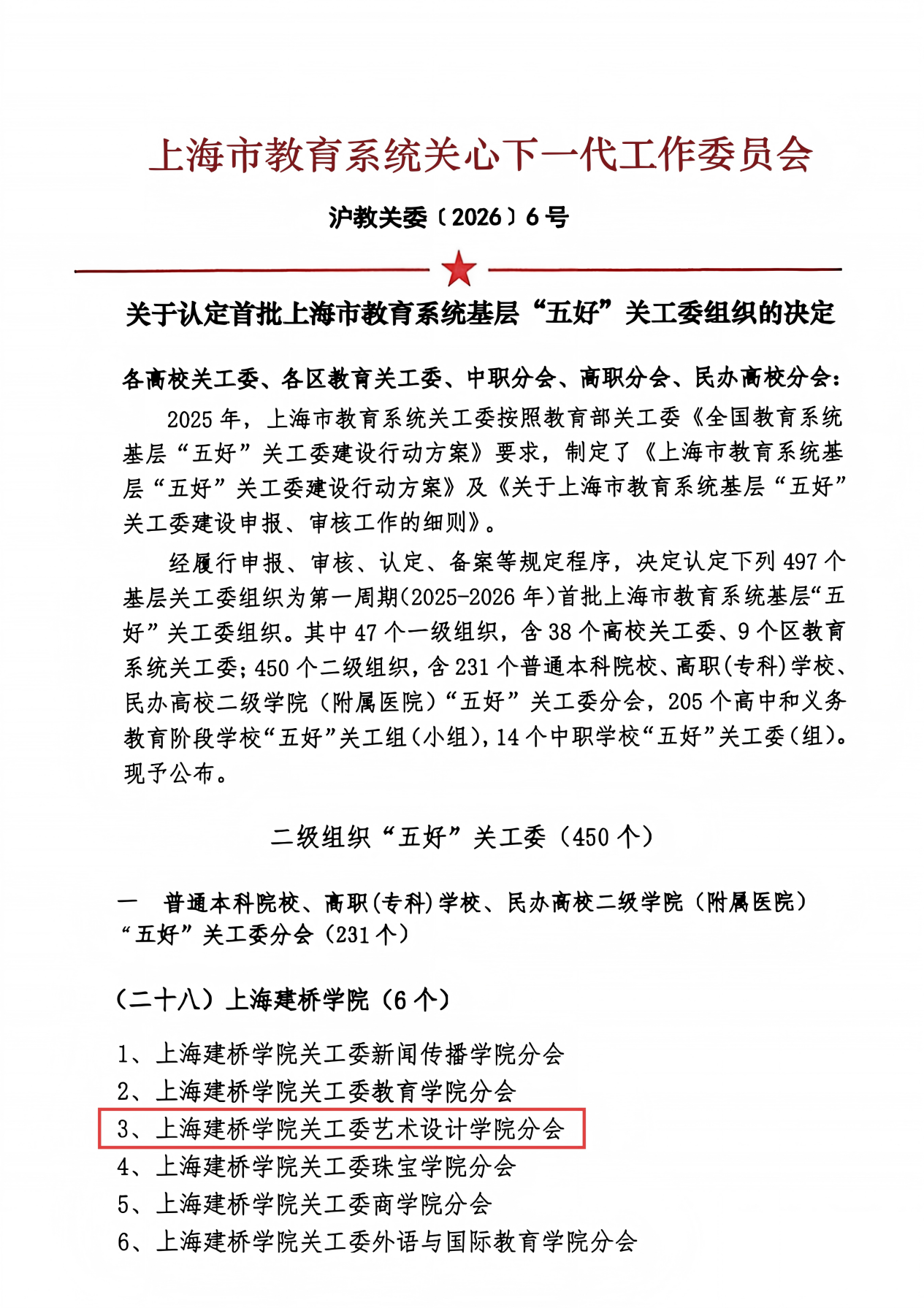 喜报|上海建桥学院关工委艺术设计学院分会获评首批上海市教育系统基层“五好”关工委组织