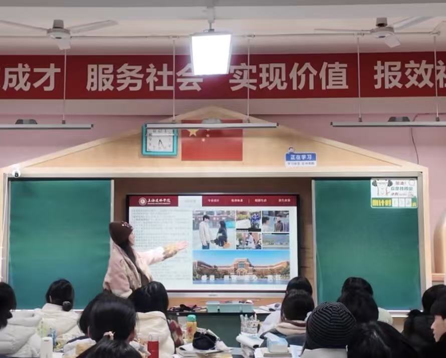 冬日暖光,归心向暖;四人同行,共传佳音。上海建桥学院商学院会计B23-4班学子宋鑫,携手健康管理学院养老服务B24-2班黄鑫怡、外语与国际教育学院商日B25-1班顾毅诚、艺术设计学院数艺B25-3班徐泽旸,在寒假期间,怀揣着对母校的眷恋与对建桥的热爱,共同踏上重返上海市高境第一中学的旅程。在高中对接人许意达老师的全程陪伴与支持下,四人分工协作、默契配合,完成了一场“情系母校 我为建桥代言”返校宣讲活动,用专业传递干货,用真诚续写温情,在回报母校的同时,收获了并肩成长的珍贵回忆,搭建起母校与建桥之间的温暖桥梁。重返故园,师恩如旧伴前行。“再次踏入高境一中的校园,熟悉的校训‘会学习、会做人、会生活’依旧醒目,亲切的师长、朝气蓬勃的学弟学妹,瞬间勾起了我高中时期的珍贵回忆。”作为此次返校宣讲的主导者,宋鑫坦言,能以建桥学子的身份重返母校,将自己在建桥的所学所感分享给学弟学妹,既是一份荣幸,更是一份责任。此次走访,不仅是为了回望青春、重温师恩,更希望借助自己与三位同行学子的亲身经历,搭建起建桥与高境一中的沟通桥梁,帮学弟学妹们全面了解建桥的优势特色,尤其是结合高境一中艺术见长的办学特点,针对性