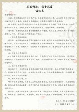 4月15日,职业技术学院部分因疫情转运到外省市的学生自发撰写倡议书,提出积极配合学校疫情防控,落实防疫措施,科学规划学习时间,做好自我健康管理,做好宣传解说工作。据了解,职业技术学院这批学生自4月13日确定为密接人员,根据疫情联防联控机制,后被转运至外省市隔离。隔离期间,同学们积极配合隔离点医护人员做好自身防护,按时参加线上课程学习,当好疫情防控工作的解说员。期间同学们互帮互助,全力配合,共克时艰。同学们自发撰写倡议书,旨在发出同学呼声,感谢所有医护人员的付出,感谢地方人民的深切情谊,同时,也是自律公约,争取在配合下,早日打赢疫情防控阻击战。