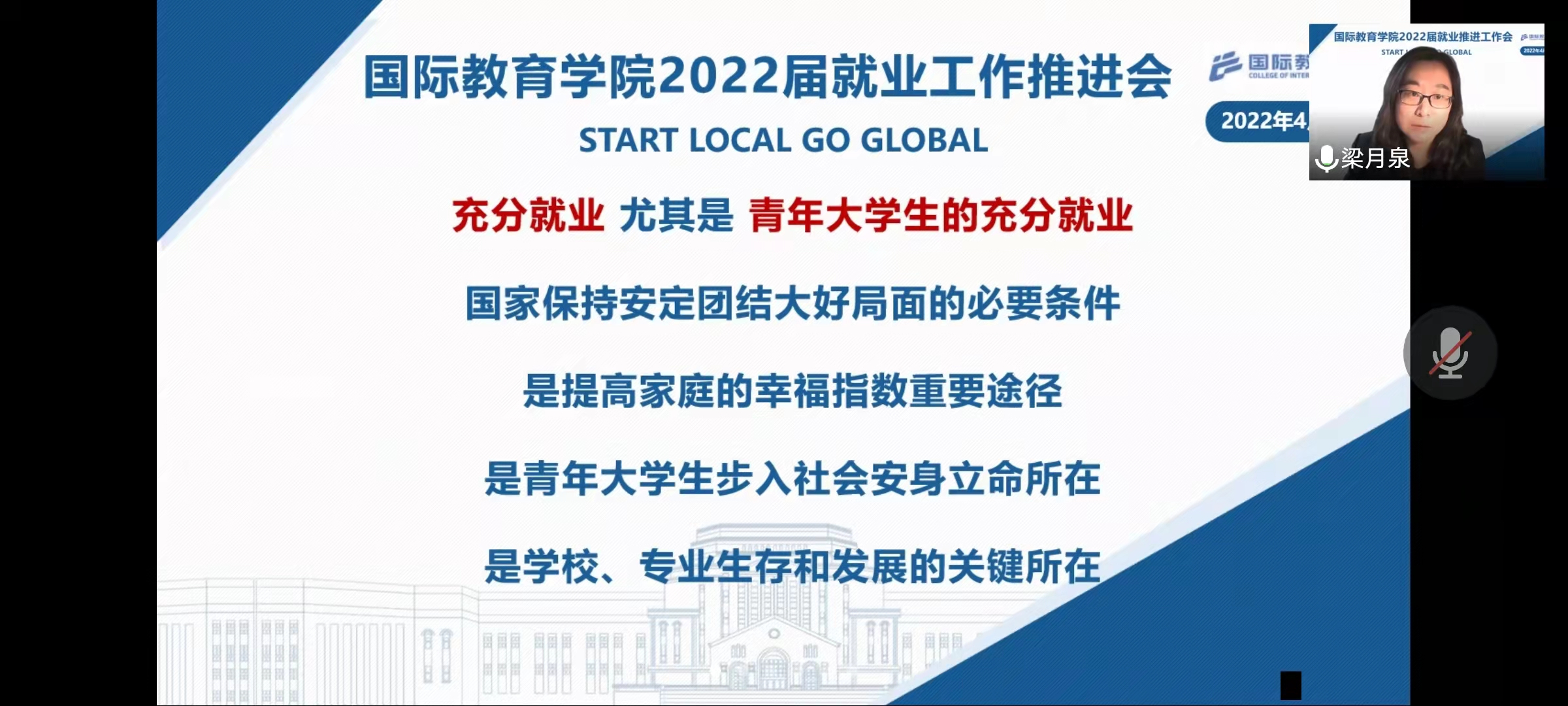 4月14日下午,国际教育学院召开2022届毕业生就业工作推进会。学院领导班子、各专业主任、院办主任以及全体辅导员通过腾讯会议线上参会。会议由党总支书记周英芬主持。梁月泉院长“讲清楚了就业的重要性”,她从国家和人社部对高校毕业生的就业、创业支持政策入手,讲解了今年就业工作的形势,以及就业工作对于国家、社会、学院以及个人的重要性,她还分析了今年就业工作的重点和难点,号召全院师生勇于面对困难和挑战,要求各专业做好毕业生的就业推进工作,鼓励毕业生脚踏实地地选择就业岗位,在奋斗中实现自我价值。周英芬书记传达了4月11日学校2022届毕业生就业工作推进会的会议精神与就业工作部署,她还“讲清楚了疫情背景下严峻的就业形势”,汇报了学院目前的就业进展情况,提出了学校和学院就业目标和工作要求,希望各位老师集思广益、资源共享,“齐心协力战疫情、保就业”。刘潇滢副院长“讲清楚了毕业要求”,她强调了今年的毕业时间节点和各专业的毕业要求,鼓励老师们要充分运用校企合作的资源:一方面积极拓展校企合作资源,目前已有几家优质企业对学院的毕业生满意度和专业匹配度比较高,比如埃森哲等;二是广泛动员、鼓励学生投递简历,借用校企