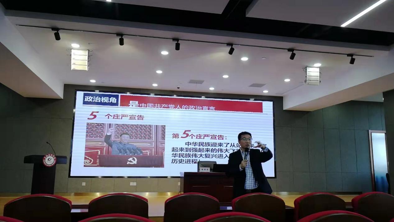 为深入学习贯彻习近平总书记在党史学习教育动员大会、庆祝中国共产党成立100周年大会等一系列重要讲话精神,认真落实基层党建工作责任制,加强基层党支部建设,10月29日,信息技术学院党委在珠宝学院四楼会议室组织开展“头雁工程”党建专题培训,邀请陶思亮教授进行理论宣讲,我院全体党员参与,学院党委副书记徐娜主持。陶思亮教授以“弘扬伟大建党精神 落实立德树人根本任务——学习贯彻习近平总书记‘七一’重要讲话精神”为主题,从政治视角、理论视角、实践视角三个角度切入,带领党员同志深刻认识了习近平总书记“七一”重要讲话的历史地位与重大意义,以精炼的脉络形式,围绕伟大的建党精神、九个必须等方面,全方位主旨鲜明地阐述了习近平总书记“七一”重要讲话的精神内涵与重大意义。全体党员同志要从习近平总书记“七一”重要讲话中汲取精神力量,大力传承弘扬伟大的建党精神,听党话、感党恩、跟党走,同心向党,奔赴远方!本次宣讲主题鲜明、脉络清晰,深入浅出、通俗易懂,帮助党员们深化了对习近平总书记“七一”重要讲话精神的理解和把握。党员老师纷纷表示,要积极响应习近平总书记和党中央的号召,认真学习贯彻“七一”重要讲话精神,以史为鉴