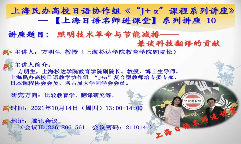 10月14日下午,职业技术学院商务日语专业的“上海日语名师进课堂”活动正式启动,本次活动通过讲座形式,运用“云课堂”资源腾讯会议平台进行。 “上海日语名师进课堂”活动是由上海民办高校日语教学协作组策划与组织,在高职新国标背景下,以提高学生的综合素质为目标的综合型系列讲座活动。本次活动有幸邀请到了上海杉达学院教育学院副院长、博士生导师方明生教授为我校师生做了关于《照明技术革命与节能减排——兼谈科技翻译的贡献》(日文:固体照明革命と省エネ――科学技術翻訳の貢献を兼ねて)专题讲座。职业技术学院应用外语系主任左翼副教授、商务日语专业创新创业综合实训指导教师魏嘉敏以及商务日语专业20级、21级、日语专业20级、21级学生共计近200人参加了本次活动。讲座中,方明生教授以翔实的数据,生动的事例和风趣幽默的语言阐述了照明技术革命与节能减排之间的关系,同时从日语翻译的角度明确了科技翻译的重要性,整场讲座紧扣技术革命的前卫特点,思路清晰,叙述层次分明。据悉,本次讲座的举行,不仅为学生搭建了科技文化知识的平台,同时开拓日语专业学生对日语翻译领域的视野,增进了学生的日语学习热情,丰富学生的日语学习内容。