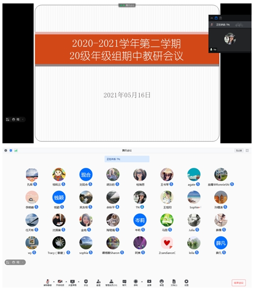 为全面了解前半学期教学过程中各个环节的运行状况,发现并改进教学中存在的问题,以便更好地完成后半学期的教学任务,5月16日晚上19:00外国语学院大英部通过腾讯会议召开20级全体教师期中教研会议,会议由大英部副主任孔辉老师主持,20级近40名专兼职教师参加了本次会议。会议伊始,孔辉老师就课程《大学英语2》前半学期的教学情况进行了总结,并部署了后半学期的工作任务,带领老师们重温了课程考核方案,同时还强调了诸如思政教育、期末阅卷等方面的注意事项。接着,本科课程组长唐娜老师对本学期的口语考试进行了详细的介绍。最后,老师们就前半学期的教学情况进行了交流,提出了非常有代表性的问题。本次会议为接下来的工作进行了周密的安排,也为顺利完成本学期的教学工作做好了准备。