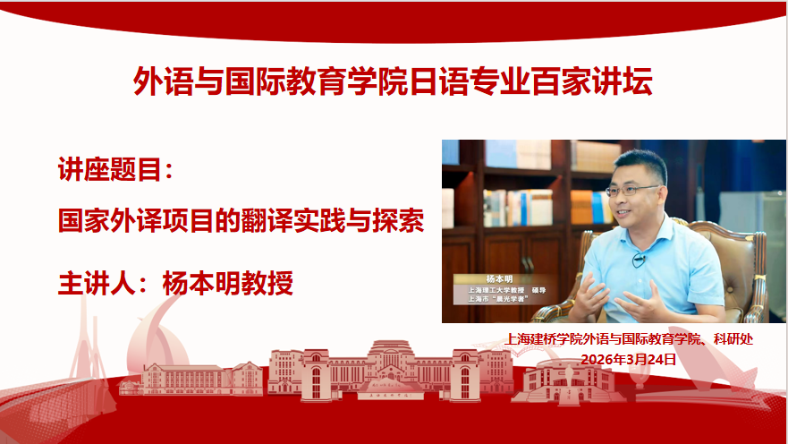 2026年3月24日,上海理工大学外语学院日语系主任、博士生导师杨本明教授应邀莅临上海建桥学院,走进《百家讲坛》大课堂,以“国家外译项目的翻译实践与探索”为题,在三教222报告厅为师生带来了一场兼具学术深度与家国情怀的精彩讲座。本次讲座由外语与国际教育学院、科研处联合主办,日语系赵萍主任主持。来自外教院各专业的师生汇聚一堂,共同聆听这位年轻学者——日语教育、翻译研究与实践领域的深耕者,如何以译笔为桥,向世界讲述中国故事。杨本明教授曾获国家社科基金“认真负责的鉴定专家”、上海市科技翻译学会“优秀科技翻译工作者”、上海理工大学“青年五四奖章”等殊荣,并兼任国家社科基金评审专家、上海市教育评估院评审专家、学术桥职称评审专家等学术职务。讲座伊始,杨本明教授首先结合自身主持完成的国家社科基金中华学术外译项目《中国科学史》申报经验,强调选题不仅需要顺应国家“典籍外译”举措的宗旨,还应该结合学校特色与译者自身优势,这是选题获准立项的关键所在。其次,杨教授通过主持完成的诸多翻译项目中的“专业词汇”“成语”“固有词汇”等典型案例,通俗易懂、深入浅出地阐释了翻译实践中,译者应该如何运用翻译理论与技巧,才能