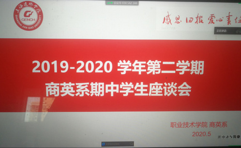 为倾听学生的声音,全方位、多角度地掌握线上教学学生学习情况,根据学院的统一安排,职业技术学院应用外语系商务英语专业于5月7日、12日,通过在线平台分别召开2018级、2019级学生期中座谈会。会议由商务英语专业主任臧玉洁主持,专业全体教师和学生代表参会。座谈会以专业教学管理工作和学生日常学习工作为主题,学生代表踊跃发言,各抒己见。他们对任课老师教学情况进行了综合性的反馈。同学们普遍反应老师们教学工作认真,教学资料准备充实,教学效果超过预期。此外,与会学生也针对个别课程和任课老师的教学方式,考勤方式,上课节奏提出了改进建议。经过调研,目前大部分学生的线上学习状态良好,但是也存在个别同学失去了上网课的新鲜感之后,逐渐进入到了倦怠期,需要老师和辅导员给与专业和心理上的辅导。臧玉洁主任总结发言,她表示,学生代表提出的合理化建议会认真考虑,存在的问题会和任课老师沟通,并会及时有效的解决。同时,臧玉洁主任还要求各位同学调整心态,线上积极完成各项学习任务。此次座谈会为学生提供了一个反映问题的平台,也让老师聆听到了学生的心声,学生和老师能够面对面地直接沟通,践行了学校“以学生为中心”的办学理念。