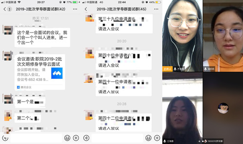 2020年4月22日至2020年4月27日职业技术学院有序启动了2019-2批次文明修身课程。一、文明修身学导选拔4月22日至4月25日我院开始了2019-2批次基层学导招新,共计46名学生报名。4月26日18:00至20:30,学院学导招聘处对所有应聘学生进行线上面试。最终选拔出22名新学导。二、2019-1批次文明修身总结暨新老学导交接仪式4月27日16:00,学院召开线上文明修身新老学导交接大会。出席此次会议的有职业技术学院党总支副书记潘明芸老师,文明修身指导老师齐家伟老师和全体新老学导们。会议开始,潘莉莉总学导对上一批次的文明修身工作进行了总结,并对上学期所有的学导表示了感谢和肯定。希望新一任学导能更加努力,在工作中取得好成绩。然后新学导代表许杨同学在大会上对文明修身工作进行了简单的讲解,表示自己作为一名新学导,将会和大家一起努力,积极带领学员们体会文明修身的意义。接着文明修身指导老师齐家伟老师发言,她希望各位老学导们能够继续保持修身精神到今后的学习和生活中去。同时对新学导们提出期望:希望新学导们能够认真履行工作职责,在工作中提升自己,遇到困难不退缩,带领学员们积极投身于文明修