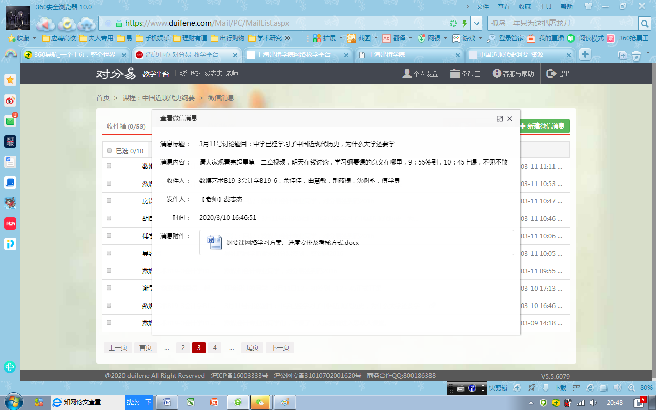 费志杰是马克思主义学院今年新进的一位副教授。初来乍到,适逢此次抗疫背景下思政课的在线教学改革。费志杰适应新形势的需要,及时调整教学方案,把在线《中国近现代史纲要》课程讲得有声有色。费老师的在线教学过程分为六步走,即导学(做好签到和课前所有教学准备)—阐述大学和中学历史教学的不同(互动发言或学生回应老师问题)—大学学习本次历史课程的价值(在老师引导下认识学习历史的价值目的)—在线测试(检测学生自学内容)—总结提升(对学习内容复习巩固基础上进行理论提升)—布置作业(布置课后学习内容)共六步。在费老师的六步中呈现如下特点:一是时间安排比较紧凑合理。为了提升课堂90分钟的互动效率,他把每一分钟都进行了合理分配,争取做到不浪费一分钟。如课前上课提示、上课考勤、在线测试、在线随堂提问、重难点讲解、集中讨论、课堂总结等多个教学环节,学生普遍感觉受益匪浅。二是内容较为丰富、形式较为灵活。从对分易签到码的发布,到缺勤学生的督促与询问;从在线测试题的开始,到测试成绩的发布;从随堂提问,到学生抢答;从不同讨论话题的选择,到学生自由设置讨论话题,让全体学生都尽情参与,最大程度上防止游离于课堂之外的现象出现。三