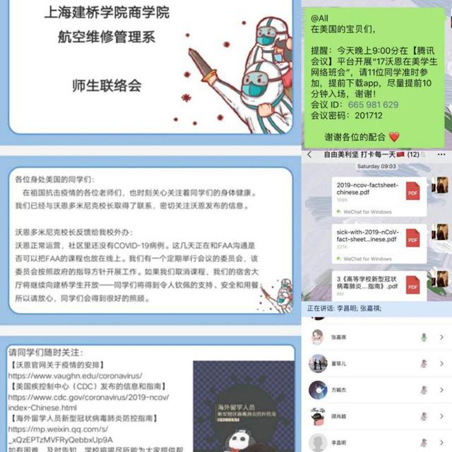 随着疫情在全球范围内的扩散,商学院也时刻牵挂着正在海外留学的学子们。院领导通过腾讯会议的方式,与商学院正在美国沃恩航空科技大学留学的58名同学以及在日本留学的8名学生分批召开了疫情期间师生联络会,加强对海外学生疫情防控教育和管理,航空维修管理系、旅游系、电商系系主任以及相关辅导员一同参与了网络会议。在会议上,学院领导向身处海外的学生们表达了问候,并向学生们宣讲了海外留学人员新型冠状病毒肺炎防控指南,关照同学们务必要把安全放在首位,做好个人防护,审慎出行,减少不必要的外出、聚会等活动,避免前往人群集中的场所,以降低感染风险。同时安抚学生要理性面对疫情,科学进行防控,及时调整心理和情绪,加强相互关心和友爱,不信谣、不传谣,不恐慌,如遇困难,要及时告知学校,学校将竭尽所能为大家提供帮助。同学们也就自己目前的学习的生活情况与领导和老师们进行了沟通和交流,并提出了面临的一些困难,对于学生们提出的困难,学院领导及时给出了回应。通过这次远程会议,希望让远离故土的学子们能够感受到祖国始终是他们最坚强的后盾,学校永远是他们最温暖的家,老师永远是他们最值得依赖的朋友,并传递给同学们战胜疫情的信心,期待他们