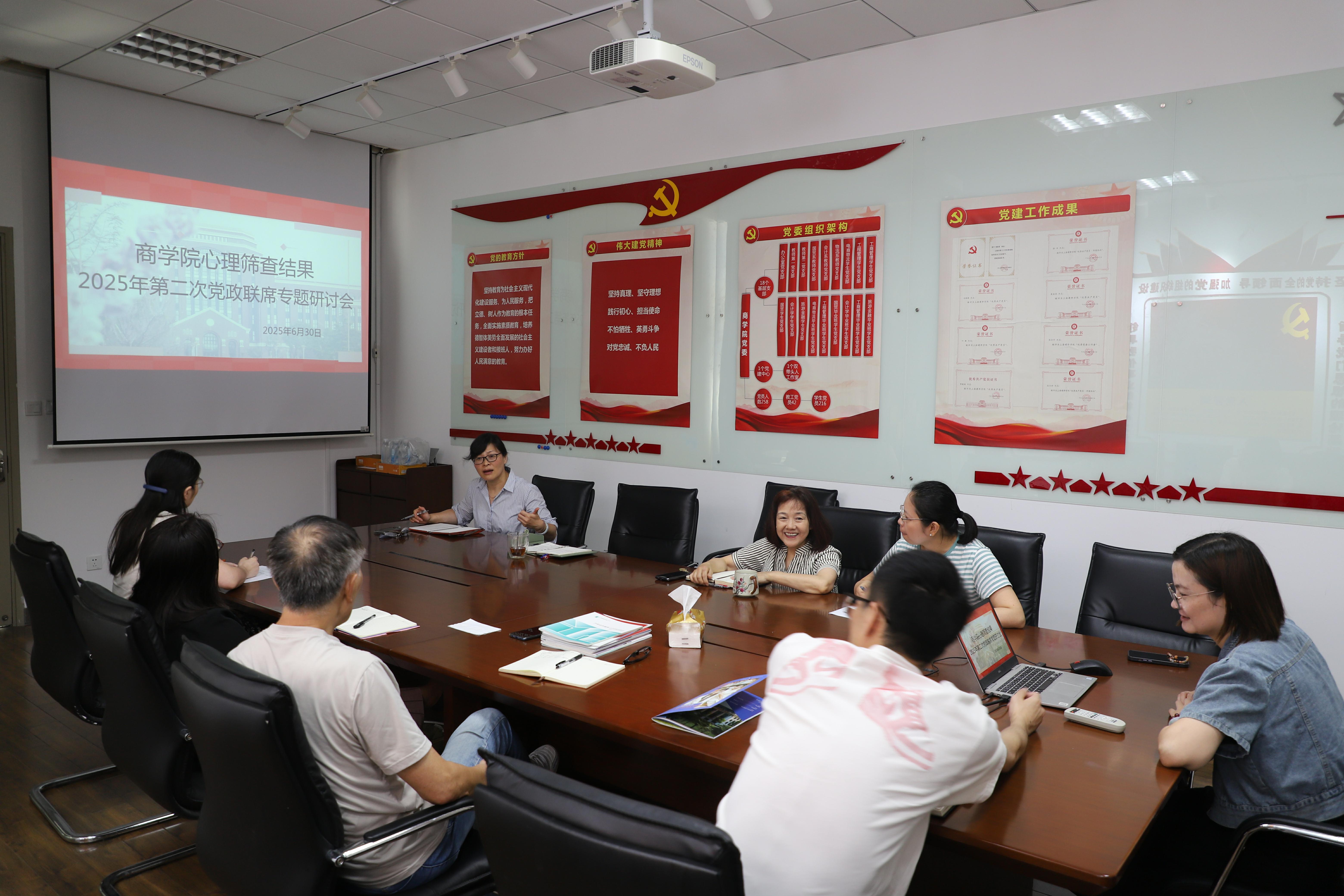 6月30日,商学院在333会议室召开心理健康工作党政联席专题研讨会,聚焦学生重点心理问题与干预措施。学院党委副书记俞海燕就当前学生心理筛查结果做汇报和交流,学院党政班子成员参会。会上,俞海燕强调,大学生心理健康教育工作是落实立德树人根本任务的重要环节,关乎学生成长成才与校园安全稳定。随后汇报了学院本学期学生心理健康工作开展情况,分析了当前学生群体面临的学业压力、人际交往、职业规划等现实问题。从“在校生心理危机排摸”和“延毕学生心理危机排摸”两方面,结合不同群体的学生特点,对筛查结果进行详细分析,学院党政班子成员就具体数据和重点关注对象进行讨论和交流。与会人员围绕如何强化心理健康教育课程建设、完善危机干预机制、提升心理育人能力等展开研讨。提出通过开发特色心理健康课程、构建“校-院-班-舍”四级预警网络、加强心理健康专题学习培训等举措,推动心理健康工作提质增效。此次研讨会进一步凝聚了思想共识,明确了工作方向。学院将以系列专题研讨会为契机,整合多方资源,构建并完善全员、全过程、全方位心理育人格局,切实为学生心理健康保驾护航,助力培养身心健康、全面发展的新时代大学生。供稿:许东霞