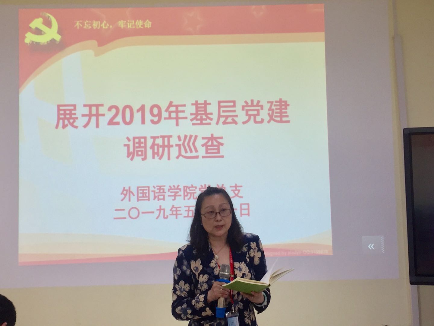 2019年5月30日12时30分,外国语学院党总支在外国语学院129室召开了全体党员大会,会议应到党员39名,实到26名,会议由外国语学院党总支书记江萍副教授主持,会议的主题是迎接学校党委组织部即将展开的2019年基层党建工作调研巡查。结合外国语学院的党建实际,江萍书记从要严格落实组织生活制度,及时完善各项会议记录、入党材料,充分发挥教师党员的先锋模范作用三个大的方面进行了工作部署和动员教育。一是各个支部要要求每名党员主动亮身份、戴党徽、树形象;二是党员教师要带头开展课程思政;三是党员教师要带头注重师德师风,并指出了当前存在的一些不良现象,如个别老师上课不点名、不记考勤,上课不讲课,上“水课”等等;四是党员教师要带头积极参加学校和学院组织的各种活动;五是对三个支部积极申报学校党建项目的金艳、焦丽、赵磊三名党员老师给与了肯定与表扬。通过召开这次党员大会,全体党员进一步统一了思想,提高了认识,明确了目标,纷纷表示将以更大的工作热情、更高的工作标准,为外国语学院的全面发展发挥一名党员教师应有的先锋模范作用。 最后,江萍书记要求各支部对因课、因公缺席的党员要落实好补课制度。