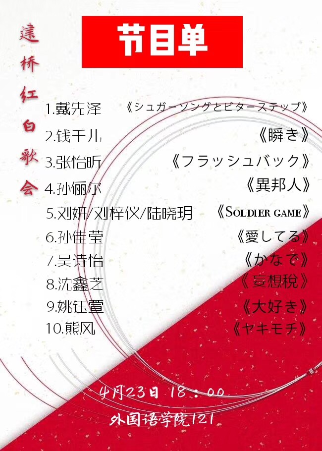 2019年4月23日晚上6点,临港四校“红白歌会”建桥初赛在外国语学院日语情景教室顺利举行。初赛共有10组选手参赛,演唱的曲目类型丰富,包括JPOP、日剧主题曲、动漫歌曲等等。由日语系的西村秀树老师、刘尔瑟老师、贺亚茹老师以及上一任日语研修会会长王紫宸同学担任评委。经过激烈的角逐,最终张怡昕同学夺得冠军,钱千儿和孙佳莹两位同学分别获得第二名和第三名。这三位同学将代表我校参加临港四校“红白歌会”的决赛。此次活动旨在丰富同学们的日语学习形式,激发学习日语的热情,营造健康向上的良好氛围。此外,通过比赛使得学生们在学习外语的同时,也展现了自我风采,体现出了健康向上的青春面貌。撰稿:刘尔瑟
