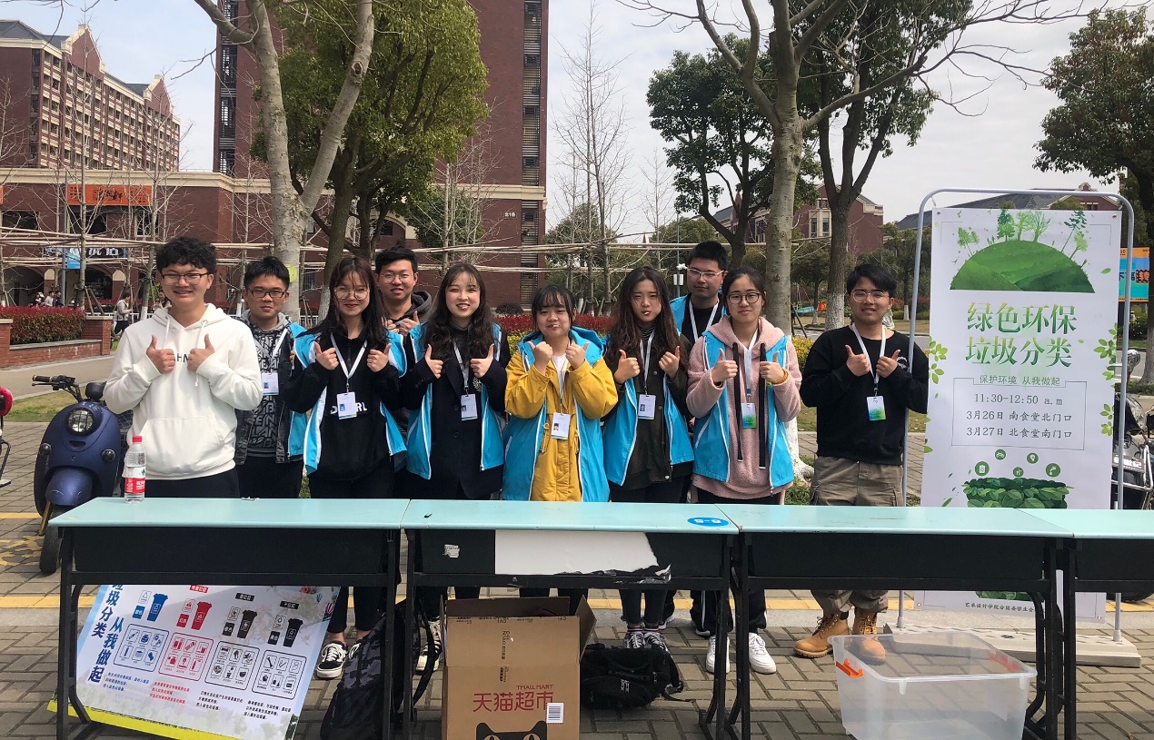 2019年1月31日,上海市十五届人大第二次会议表决通过了《上海市生活垃圾管理条例》,并将于今年7月1日起正式施行。为积极响应上海市垃圾分类号召,普及垃圾分类知识,增强学生的环保意识,由艺术设计学院分团委学生会主办、权益部承办的垃圾分类知识宣传活动于2019年3月26日和27日中午11点40分到12点50分别在南、北食堂门口展开。活动前期,权益部精心制作了易拉宝和垃圾分类知识宣传展板,并在展板上标注出垃圾类别及其图标,以便同学们识记。活动当天,伴随着动感、富有活力的音乐,我院志愿者还在现场进行垃圾分类知识宣讲,“生活垃圾一般可分为四类:有害垃圾、可回收垃圾、湿垃圾、干垃圾。”听到这里,原本只是匆匆路过的同学们纷纷停下脚步,驻足浏览,积极参与我们的活动。本次活动内容丰富、形式新颖,主要采用积分闯关制,每一关十分,共三关。其中,第一关“看展板、识标志”,通过观看展板内容学习垃圾分类知识,识别垃圾分类标志。第二关“答对题、来闯关”,通过参与垃圾分类知识问答获得积分,答对一题得1分,答错不得分;第三关“用乒乓、归归类”,参与者将标有不同垃圾的乒乓球放入正确的“垃圾桶”内,投放正确得1分,投放错
