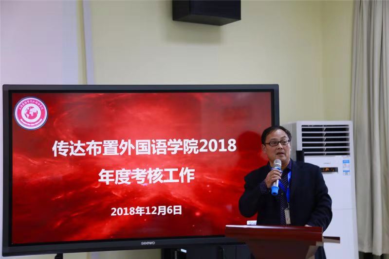 12月6日下午,外国语学院传达布置2018年度考核工作会议在学院楼129室举行,院党总支书记杨大亮和全体教师参加。