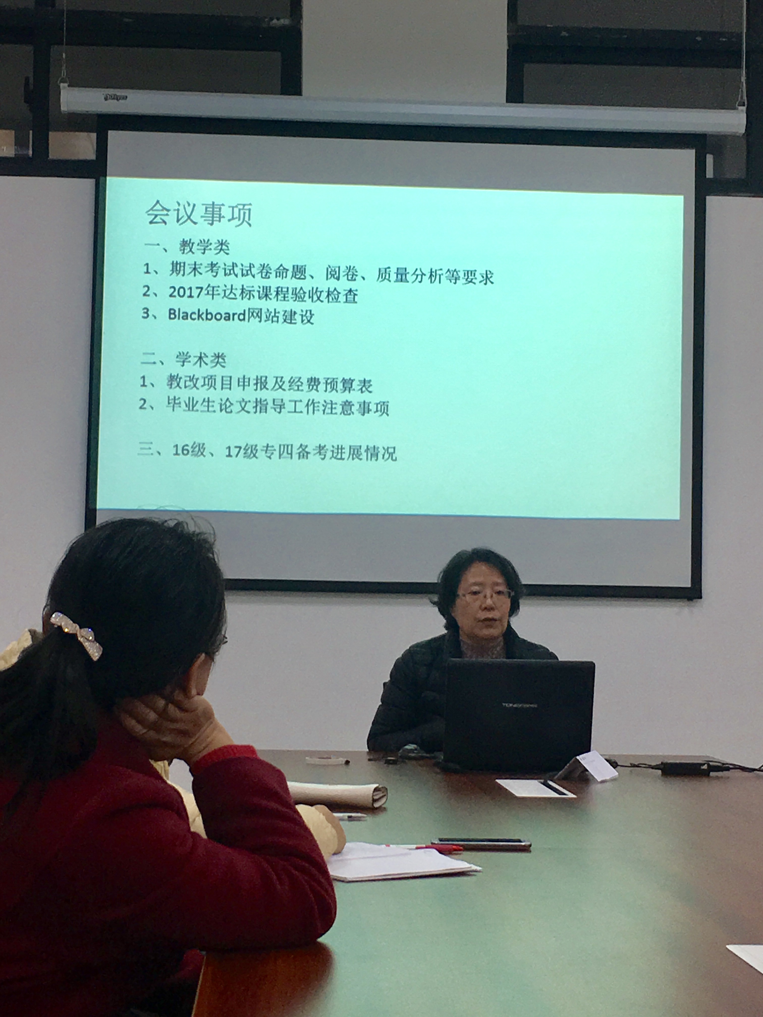 11月29日下午,英语系在外国语学院120室召开教学会议,全体教职工参加,英语系主任杨瑛主持。杨主任进行期末工作部署,重申了期末考试试卷命题、阅卷、质量分析等要求。