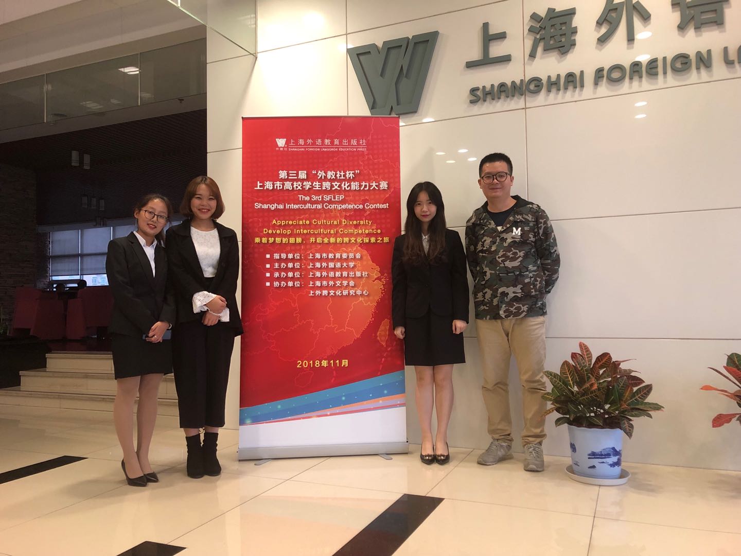 11月9日至10日,由上海外国语大学主办的第三届“外教社杯”上海市高校学生跨文化能力大赛在位于虹口区的上海外语教育出版社举办。外国语学院英语系教师李晓峰带领英语系17级李慕遥、俞佳文、张乃佳三名同学在决赛中喜获优胜奖。