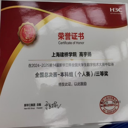 初夏时节,西子湖畔,万木葱茏。第十四届新华三杯全国大学生数字技术大赛全国总决赛于2025年5月10日至2025年5月12日在浙江省杭州市新华三集团总部举行。该比赛由中国通信企业协会和新华三技术有限公司共同举办。经过预赛选拔赛,共有200名个人和80个团体晋级全国总决赛。信息技术学院网络工程系学生高宇扬经过预赛选拔,晋级决赛,参加本科组个人赛决赛。晋级决赛的本科组个人赛有100余人。经过激烈角逐,高宇扬同学荣获本科组(个人赛)三等奖的好成绩。成绩的获得是同学自己的努力,也有蒋中云教授和张思老师的指导助力。 赛后高宇扬同学表示,通过参加比赛,在实际工程应用中锻炼的自己的专业技能,开阔了专业视野。在比赛的同时,新华三集团还安排老师参加产教融合、数字化教材开发讲座。通过讲座了解了新华三关于产教融合、数字教材(含第二课题)的观点和看法,对我们的教学工作有一定的借鉴价值。通过参观新华三的创新体验中心和新华三未来工厂,了解了目前网络设备和垂直行业解决方案、AI技术、智能化制造工厂等方面的最新发展现状。张思 图文