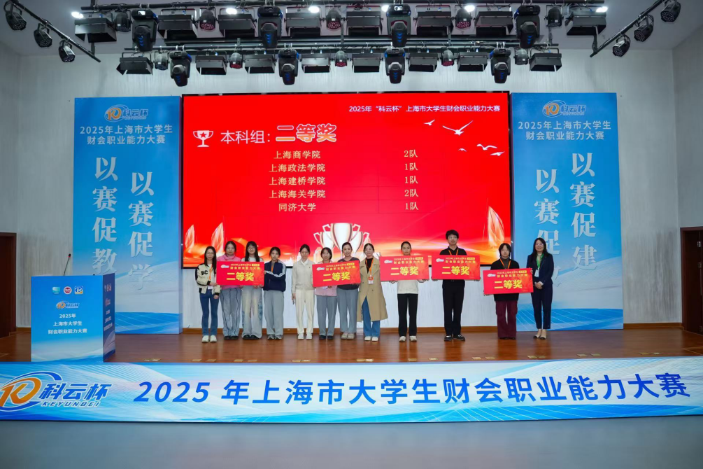 11月9日,由上海市教育委员会主办、上海立信会计金融学院承办的2025年“科云杯”上海市大学生财会职业能力大赛成功举办。比赛共有来自同济大学、上海大学、华东理工大学等18所上海本科院校的35支参赛队伍。经过5小时的激烈角逐,我校会计学专业顾乐韵、葛伊琳、倪琳、江心雨组成的代表队荣获二等奖,李娜、孙冬梅、何一诺、金卉组成的代表队荣获三等奖,比赛由黄怡婕、徐洁等老师指导。“科云杯”全国大学生财会职业能力大赛是中国高等教育学会《2023全国普通高校大学生竞赛分析报告》竞赛项目(国家级A类赛事),自2016年以来,已连续举办了九届,吸引了全国31个省、自治区、直辖市累计数十万人参加,已成为影响力大、覆盖院校广、参与人数多、竞赛水准高的全国性财会专业行业赛事之一。“科云杯”上海市大学生财会职业能力大赛已纳入上海市教育委员会2025年支持举办学科竞赛活动名单竞赛项目,成为对财会专业学子能力的全面检验和风采展示的重要赛事。大赛采用团队赛形式,由“业财税信息处理技能”竞赛环节和“智能化财务应用技能”竞赛环节组成。在“业财税信息处理技能”竞赛环节中,选手通过扮演会计主管、出纳、成本会计、总账会计这4个财