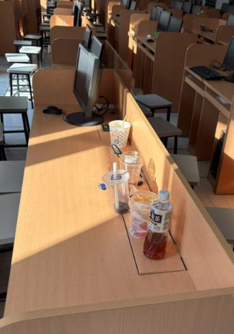 1.卫生状况较差,桌面和地下都有食物包装袋、卫生纸等
