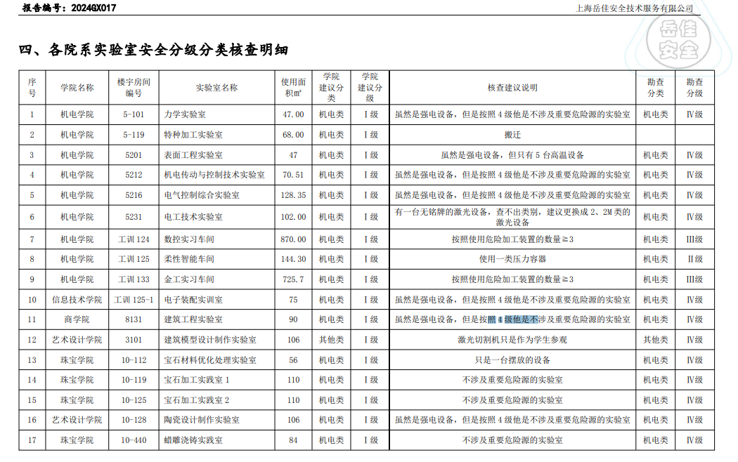 根据教育部《高等学校实验室安全分级分类管理办法(试行)》(教科信〔2024〕4 号)文件精神,结合学校实际,2024年10月,学校聘请岳佳安全技术服务公司的技术专家对实验室重点场所进行风险等级评估,根据风险源勘察结果重新对实验室分级分类并更新实验室安全信息牌。