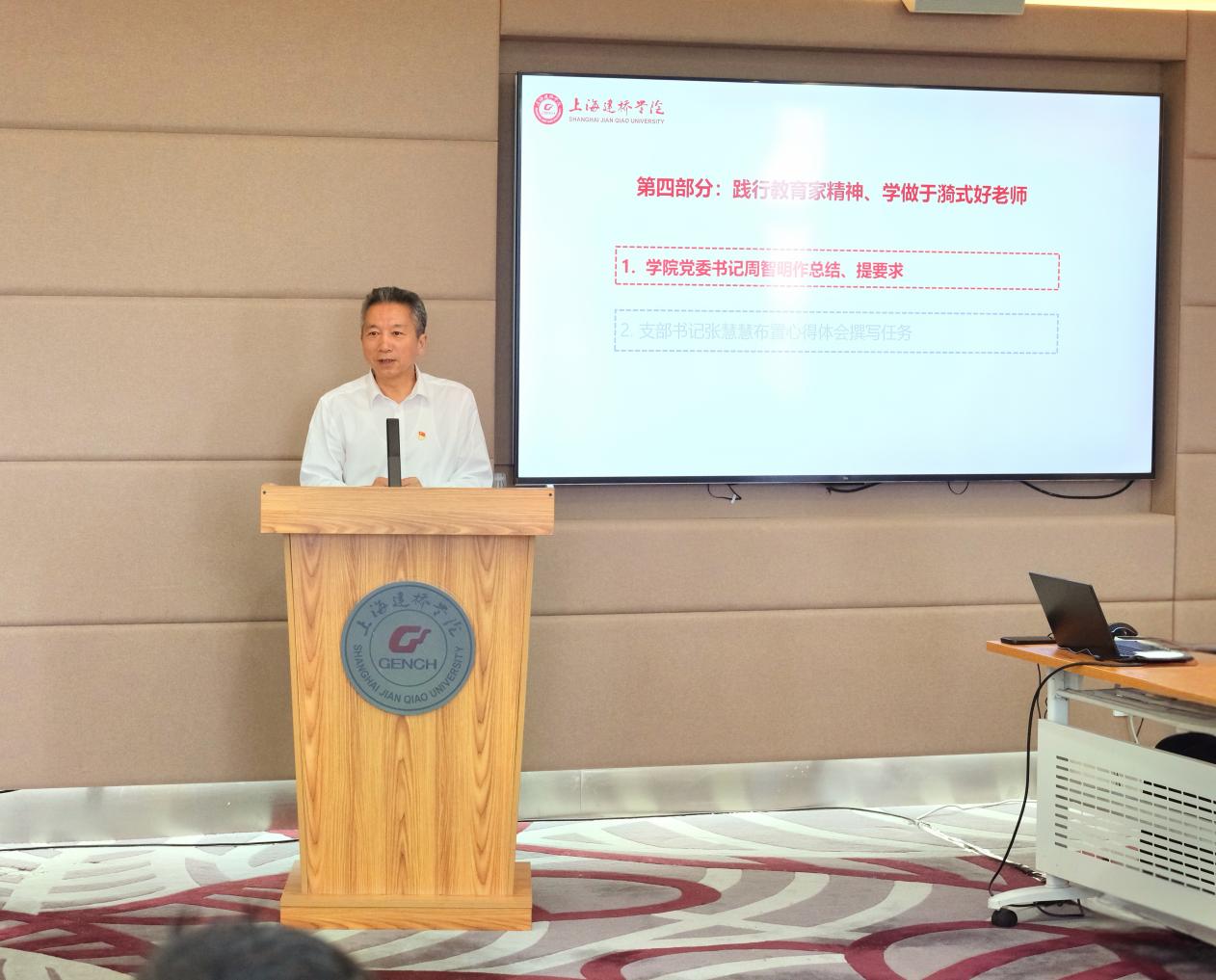 最后,学院党委书记周智明对本次主题党日做总结。首先,周书记指出四位教师党员代表的发言真实而富有启发性,与专业深度融合,各具特色。其次,周书记强调全体党员教师在新时代背景下,决不能安于现状,要继续发扬党的优良传统,深化教育教学改革,做到胸中有书,目中有人,要一个心眼为学生,不断提升专业素养和教学能力。他强调,必须充分发挥党员的先锋模范作用,借助此次审核评估的机会,进一步提高教学品质和师德素养,以实际行动践行党的教育方针,为学院的发展和学生的成长创造更加美好的未来。最后,他指出,通过主题党日活动,党员教师们应进一步增强“四个意识”,坚定“四个自信”,做到“两个维护”,在教学实践中贯彻党的教育方针,为培养德智体美劳全面发展的社会主义建设者和接班人贡献力量。
