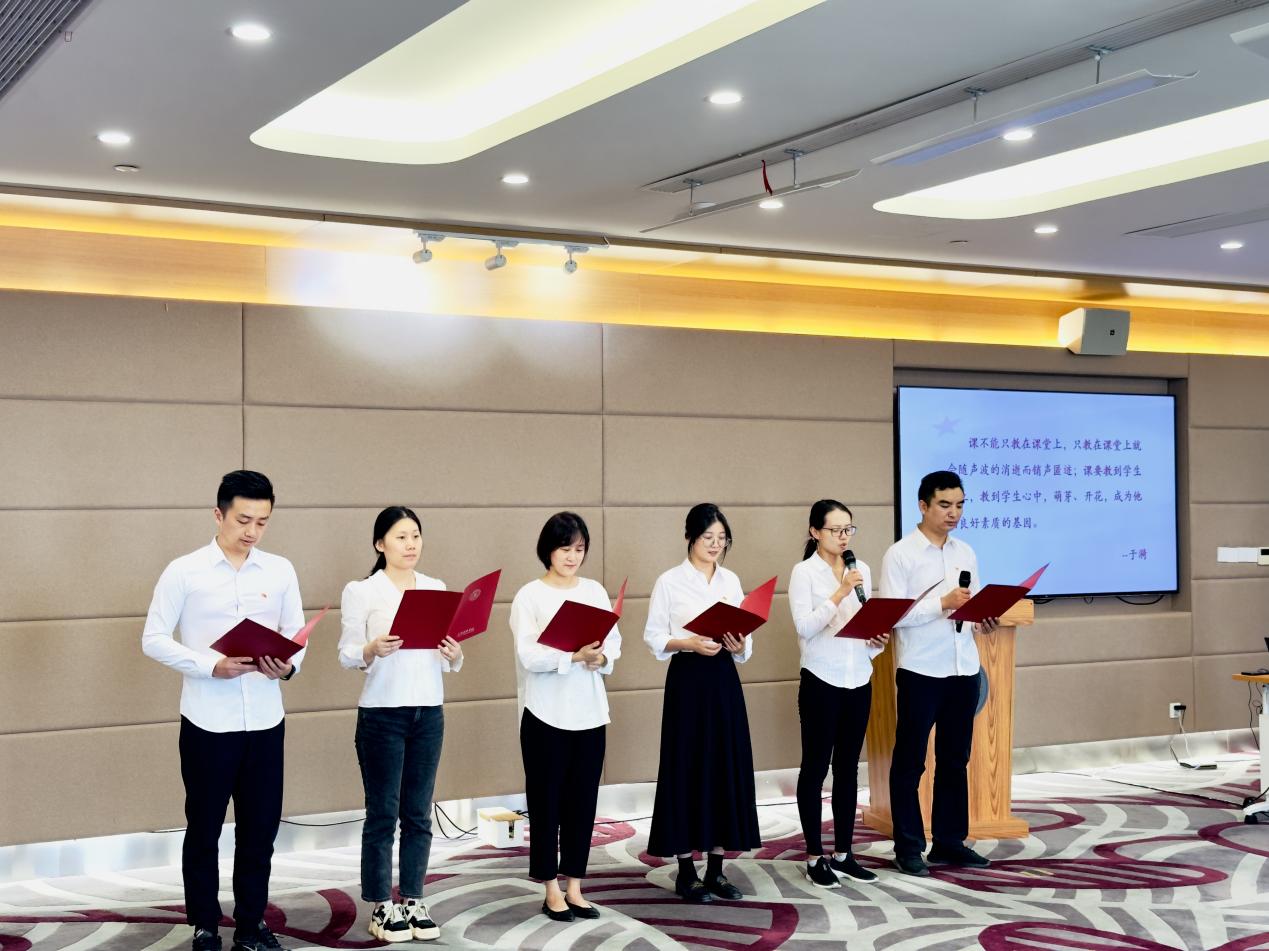 践行教育家精神,学做于漪式好老师。教师党员王清明、周鑫、余桌立、吴健、潘家宽、顾善文深情朗诵了于漪的经典语句,全体教师党员在朗诵的回响中铭记教育家的精神,并在内心立下誓言:立志成为于漪式的优秀教师。
