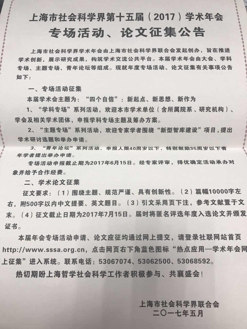 各学院、部门:上海市社会科学界第十五届(2017)学术年会专场活动、论文征集工作已开始,现将《上海市社会科学界第十五届(2017)学术年会专场活动、论文征集公告》转发给你们,请符合条件的教师积极申报。截止日期:6月30日11:00.具体事项请见附件。附件