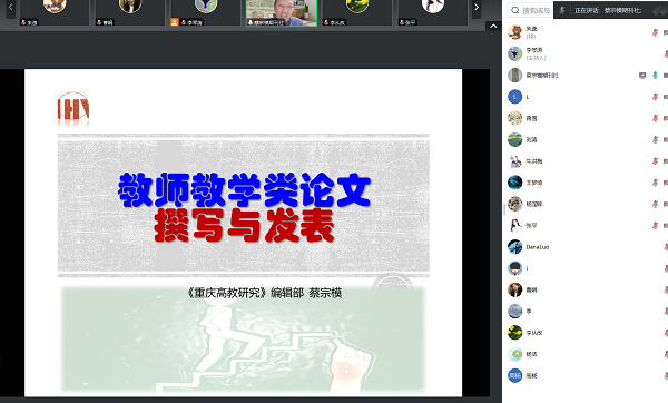 为提升教师学术论文特别是教学类论文发表水平,11月21日晚上,科研处在腾讯会议平台举办了科研沙龙活动,特邀重庆高教研究蔡宗模主任作了题为“教师教学类论文撰写与发表”的学术讲座,活动由科研处处长朱逸主持,来自各学院的教师聆听了讲座。蔡宗模从编辑兼作者视角,就学术生产的前提性问题及选题、论证、创新、投稿、修改、发表等环节,借助权威资料并结合一手成败案例,全面剖析学术生产全过程的关键要点,对教师提高学术生产的质量和成功率提供帮助。