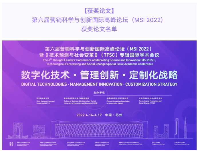 4月16-17日,第六届营销科学与创新国际高峰论坛(MSI 2022)暨《技术预测和社会变革》(TFSC)专辑国际学术会议以在线形式于西交利物浦大学举行。本次MSI会议由西交利物浦大学、中国高等院校市场学研究会、首都经济贸易大学工商管理学院和《技术预测和社会变革》期刊(TFSC)联合举办,由西交利物浦大学国际商学院承办。本届会议致力于为广大工商管理学者和实践人士搭建跨国界、跨学科的国际交流与合作平台,对中国数字经济与数字管理学科的发展和理论构建、乃至数字中国建设做出了相应的贡献。本次盛会邀请了11位国内外知专家名学者进行精彩的主题演讲;邀请到16位国内外高水平期刊主编和教授联合举行期刊主编面对面活动,与参会学者进行了深入交流;邀请到4位教育部工商管理教学指导委委员和20多位国家一流专业点负责人分享专业建设与课程思政的经验。同时,本次大会还邀请到50余位资深专家参与了平行论坛的点评与研讨,线上参会人数逾4.5万人次。我校朱逸、朱瑞庭、王鹏提交的参会论文《AI驱动下的价值共创核心要素探索——源于Q方法的消费者认知态度测量》,经过400余篇论文的匿名评审和严格的层层筛选,获得大会优秀论文提名