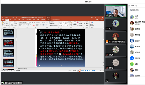 2022年4月29日下午,国际教育学院和科研处联合举办博士论坛学术讲座,由于疫情原因,本次论坛在腾讯会议上进行。来自上海外国语学院的盛文忠教授做了题为“语言类型学视野下的汉日语言对比研究”的学术报告。盛文忠先对语言类型学和对比语言学的主要内容、理论以及研究方法和特征作简要介绍和说明,再运用语言类型学和对比语言学的相关理论和研究方法对日语和汉语的具体语言现象进行分析和探讨,借此阐明其对日语研究和汉语研究的重要性和必要性。将语言类型学与对比语言学相结合,将为语言本体研究拓展更为广阔的空间,并可以对语言的共性和个性提供更为合理的类型学解释。 本次讲座有助于相关教师了解语言学研究的前沿课题;对语言教学提供方法和帮助。