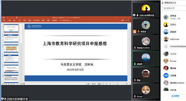 4月15日,我校科研处在线上举办了科研沙龙活动,活动邀请了我校上海市教育科学研究项目主持人,马克思主义学院沈树永老师分享了他申报项目的成功经验和感想,来自各学院的感兴趣的教师参加了分享会,活动由科研处处长助理胡毓婷主持。沈树永老师以自己的申报书为范例,全流程解析了上海市教育科学研究项目申报的过程,分享了三点成功的经验:仔细研究申报通知是成功的前提;申报书高质量是成功的关键;多请教并不断修改是提升申报书质量的根本。沈老师从申报者的视角让与会者更全面、直观地了解到项目申报的全过程,并有针对性地对各个环节提出参考建议。最后,沈老师对参与科研沙龙活动的教师提出的问题进行了详细地解答。