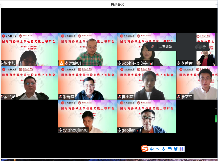 近日,我校举行与江西财经大学、上海海洋大学联培研究生毕业论文答辩会。因疫情影响,两场答辩均在线上举行。 5月14日,我校商学院与江西财经大学国际经贸学院共同举办联培研究生毕业论文线上答辩会。参加答辩的评委专家包括江西财经大学国际经贸学院的余昌龙副院长、李秀香教授、胡小芳秘书,我校朱瑞庭校长、商学院高健院长、国际教育学院周英芬书记、商学院院长助理常健聪教授。曾小莉等三位国际商务专业硕士研究生参加了毕业论文答辩会,全部通过答辩,顺利毕业。王嘉怡等三位海洋大学的在读联培研究生旁听了答辩会。江财研究生毕业答辩(视频会议) 同日,我校商学院与上海海洋大学经管学院共同举办联培研究生毕业论文线上答辩会,参加答辩的评委专家包括上海海洋大学经管学院陈廷贵副院长,我校商学院高健院长、国际教育学院周英芬书记、商学院张大成教授和院长助理常健聪教授。农业管理专业硕士研究生肖访参加了毕业论文答辩会,通过答辩,顺利毕业。樊向荣等三位海洋大学的在读联培研究生旁听了答辩会。海洋大学研究生毕业答辩(视频会议) 一如既往,我校十分重视学科建设与研究生联合培养工作。截止目前,我校与江西财经大学已累计培养了16位、与上