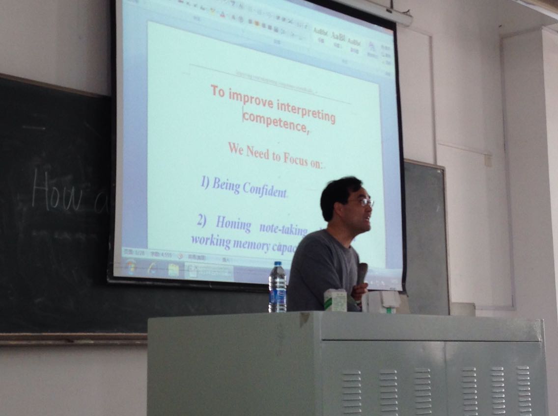 5月7日下午上海外国语大学徐海铭教授在2508教室为外国语学院师生做了“论口译能力提高的科学策略”的讲座。讲座中,徐教授用大量具体的实例论证了提高口译能力的五个策略:(1)建立自信;(2)提高记笔记与记忆能力;(3)建立思维模型(mental models);(4)积累表达的语块(chunks of expressions);(5)提高语域意识(r